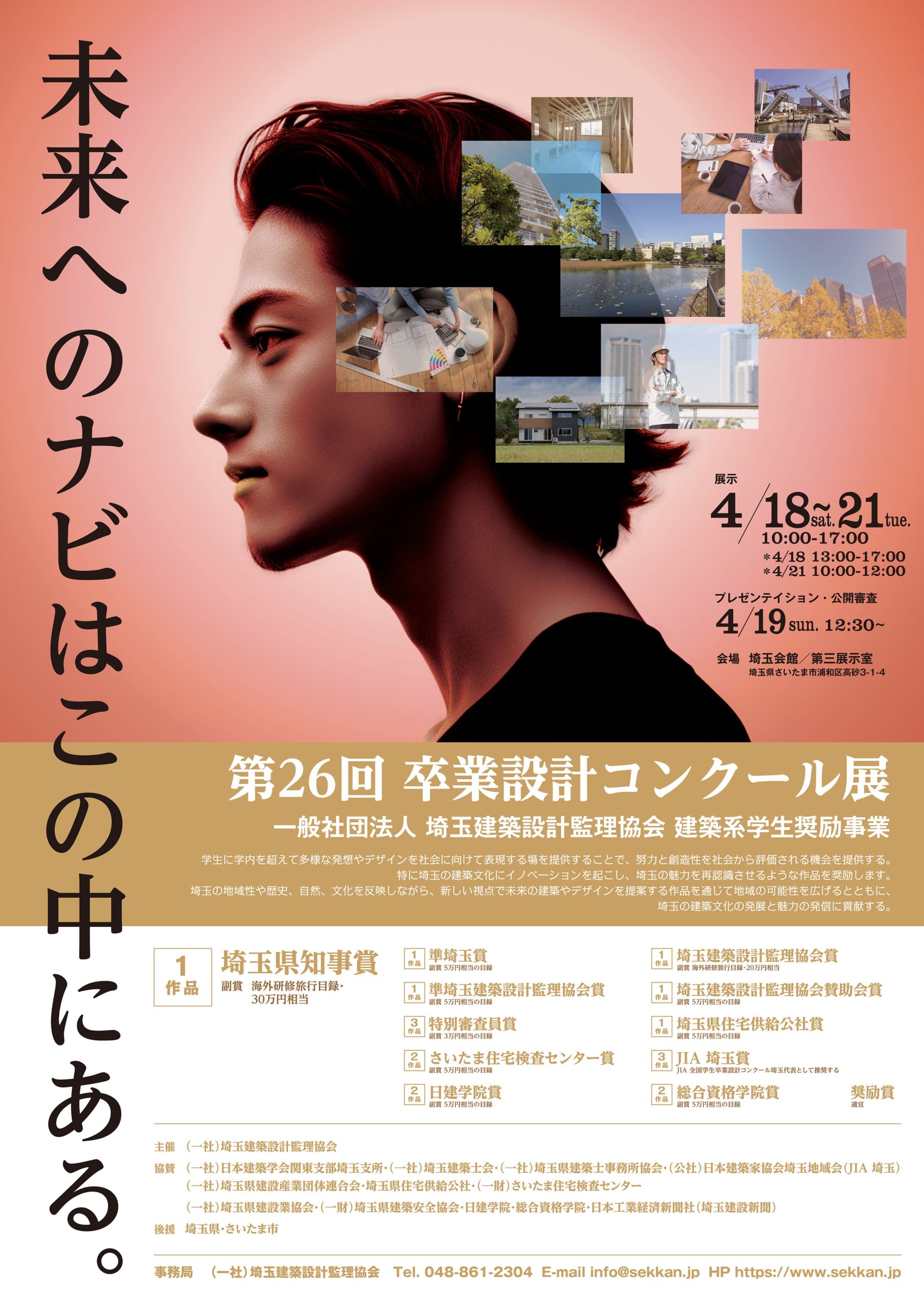 | 協賛 | (一社)日本建築学会関東支部埼玉支所、(一社)埼玉建築士会、(一社)埼玉県建築士事務所協会、 (公社)日本建築家協会埼玉地域会(JIA埼玉)、(一社)埼玉県建設産業団体連合会、埼玉県住宅供給公社、 (一財)さいたま住宅検査センター (一社)埼玉県建設業協会、(一財)埼玉県建築安全協会、総合資格学院、日建学院、日本工業経済新聞社(埼玉建設新聞) |